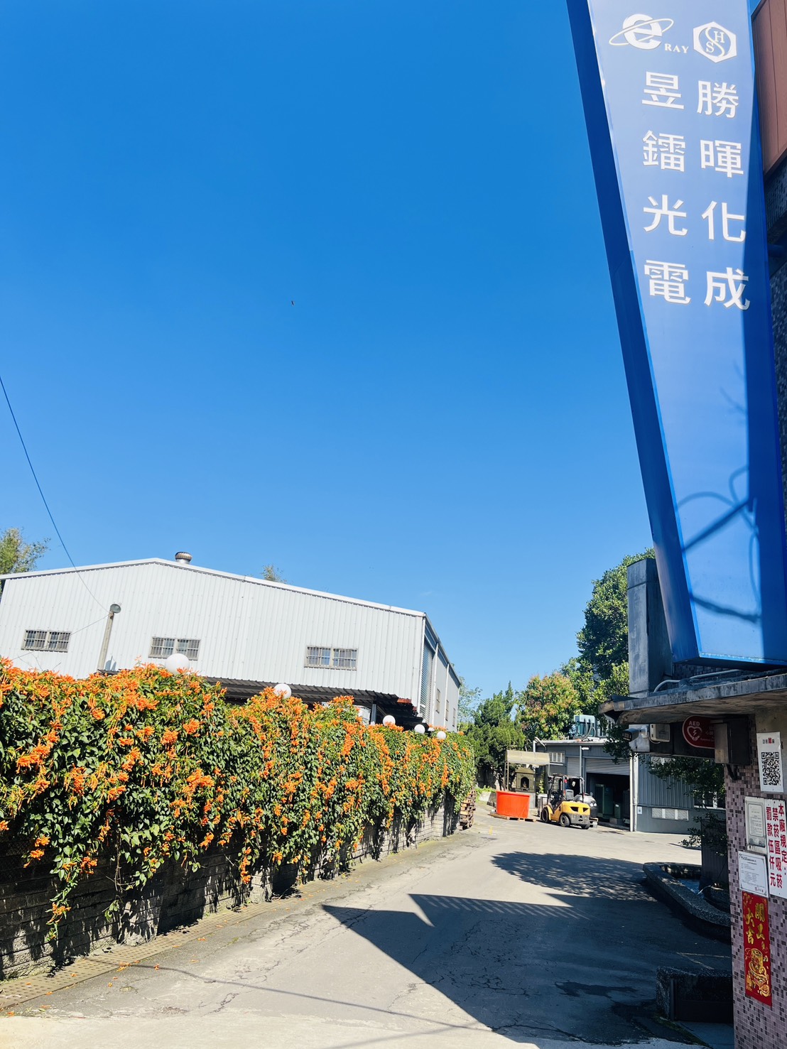 每到花季,工廠外牆的炮仗花盛開綻放,橙紅色花串如瀑布般垂掛,